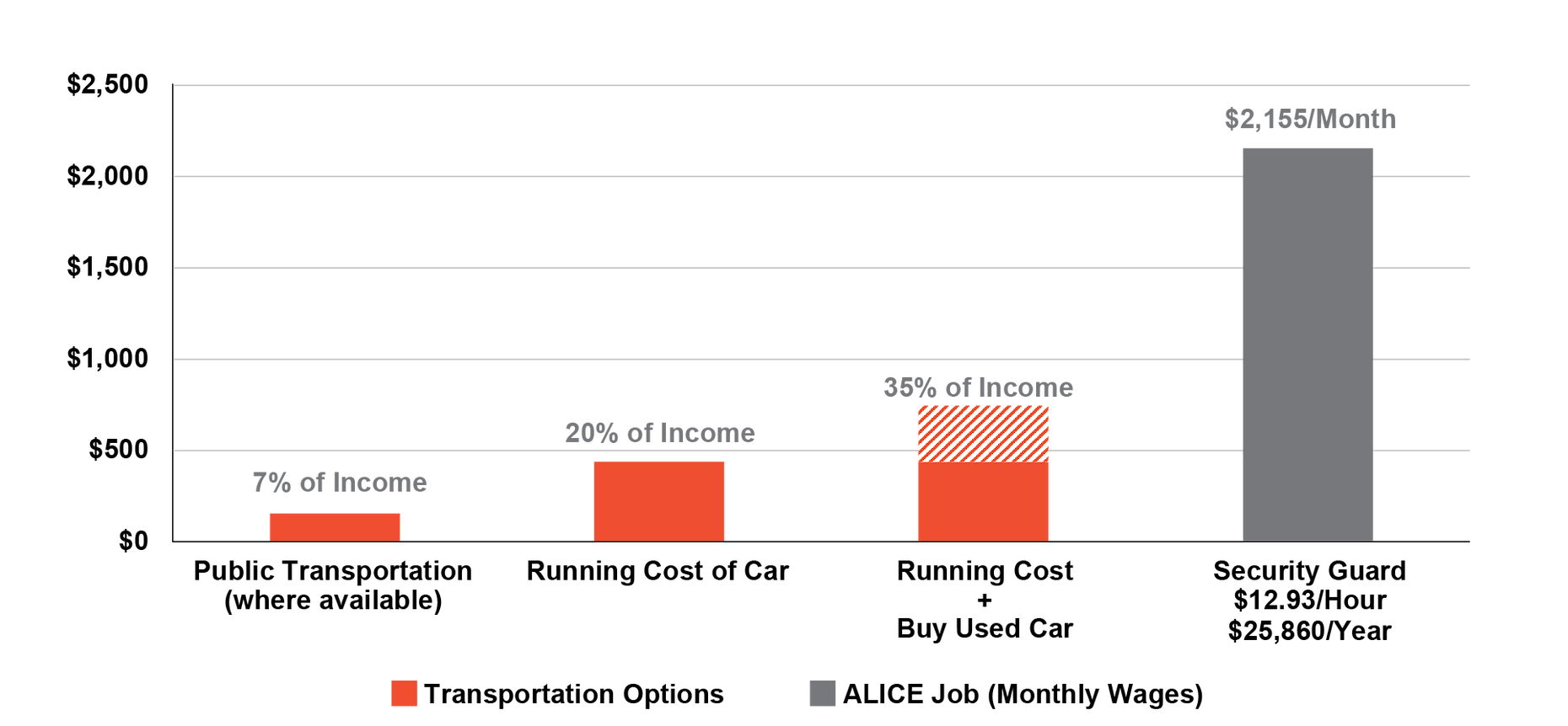 Transportation — especially vehicle ownership or leasing — consumes a substantial portion of an ALICE household budget. The figure below compares the average monthly salary of a full-time security guard with three different monthly transportation budgets for a family of four. Just over one million ALICE workers are security guards, earning an average hourly wage of $12.93, or $25,860 annually (if full time, year-round). This job usually requires a vehicle due to work locations and hours.1