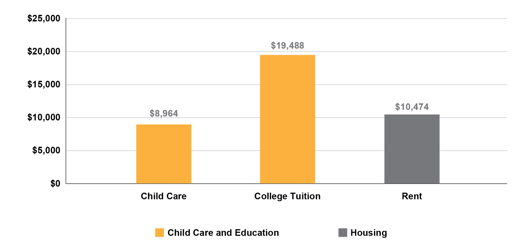 Sources: Child Care Aware of America. (2018). The US and the high cost of child care: Appendices; National Center for Education Statistics. (2017). Table 330.20: Average undergraduate tuition and fees and room and board rates charged for full-time students in degree-granting postsecondary institutions, by control and level of institution and state or jurisdiction: 2015-16 and 2016-17; U.S. Department of Housing and Urban Development. (2017). Fair market rents.