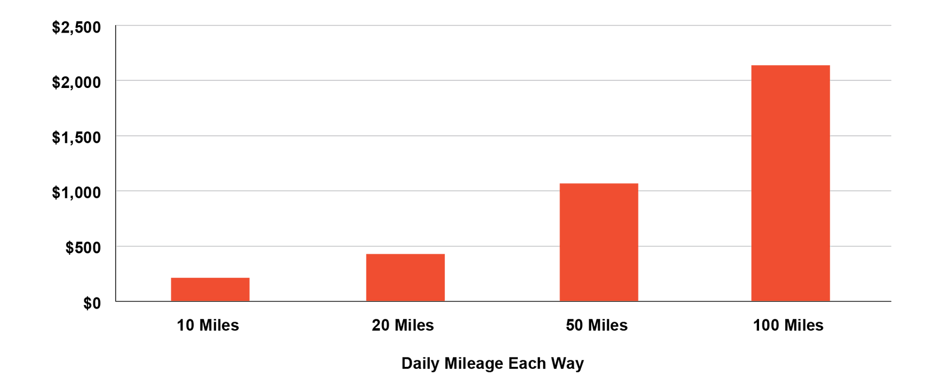 Commuting times will continue to increase: As workers seek ways to cut costs by finding less expensive housing further away from jobs or using slower but cheaper public transportation, commute times will increase. Long commute times increase tardiness and absenteeism rates and can have a negative impact on job retention, adding costs to businesses. Congestion from driving commuters also adds travel time and costs to the trucking industry, and those costs are then passed on to consumers.28 As shown in the figure below, a worker driving 10 miles each way to work every day spends, on average, $214 per month, using the Internal Revenue Service estimate of $0.535 per mile. A 20-mile commute each way doubles the cost; a 50-mile commute each way totals more than $1,000 per month.